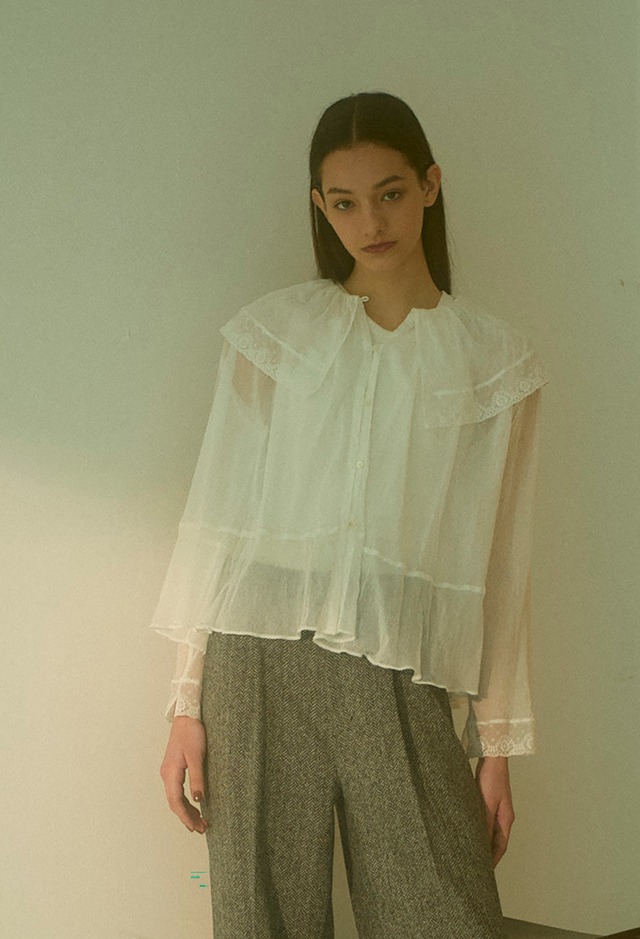 日本製の上質なコットンチュールを使用したブラウスです。 フランスのアンティークブラウスから着想を得てデザインしています。 たっぷりとギャザーの入ったフリルカラーがポイントです。 衿端と袖口にはイギリスのヴァレンシエンヌレースを使用しています。 前を開けて軽い羽織として着用するのもおすすめです。 ゆとりのある袖巾にしているので、中に薄手のニットも着用可能です。 (c/#001のレースは代替えになります。c/#000.090と同じ柄のレースになります。) SIZE L:57 B:194 肩:39 袖:58 made in japan レース cotton 95% nylon 5% 表地cotton 100% ※照明の関係により、実際よりも色味が違って見える場合があります。 またパソコン・スマートフォンなどの環境により、若干製品と画像のカラーが異なる場合もございます。 ※画像は、sampleの為、実際の商品と仕様や色味が異なる場合もございます。 ※コットンチュールの為、透け感がございます。