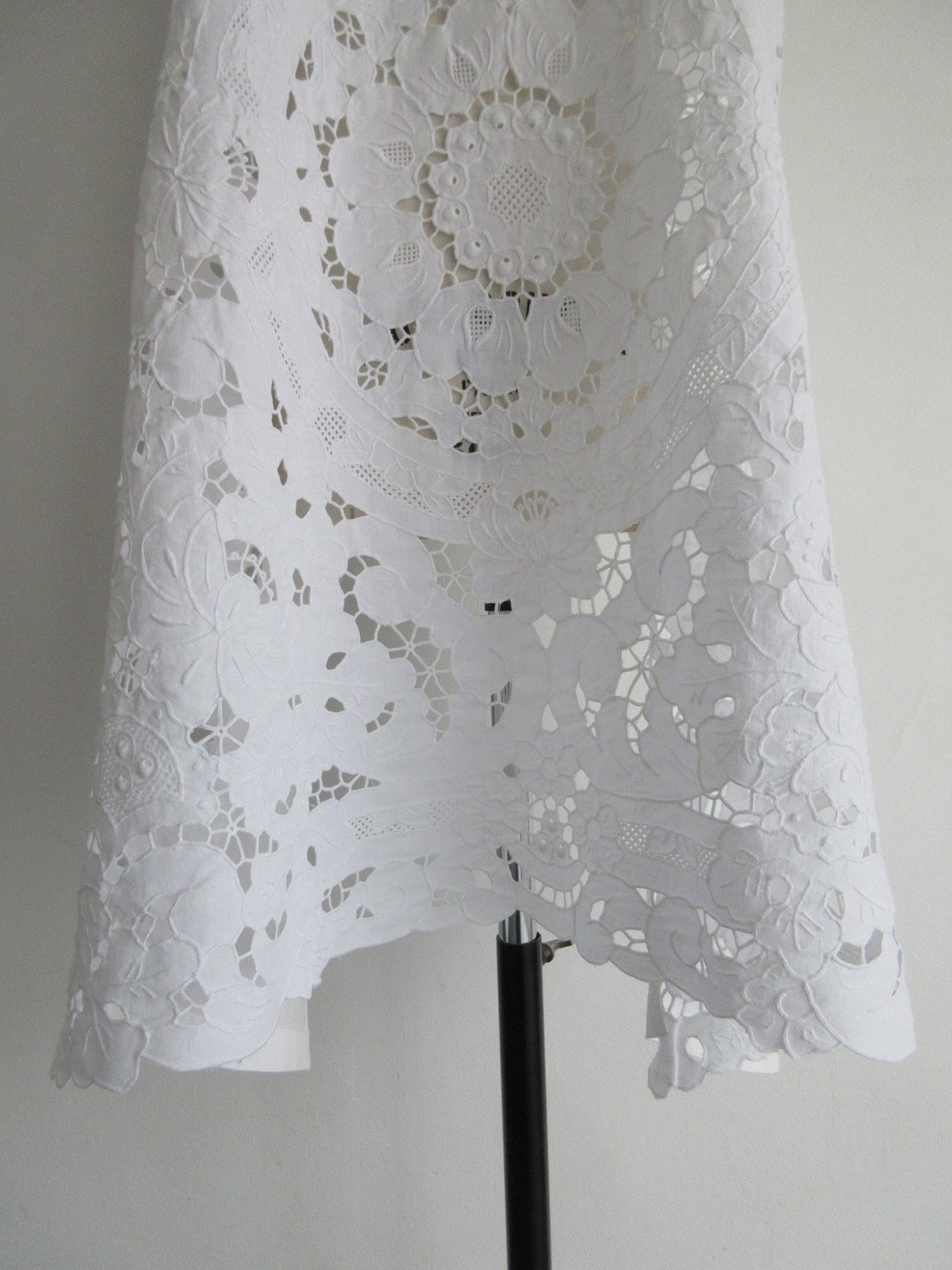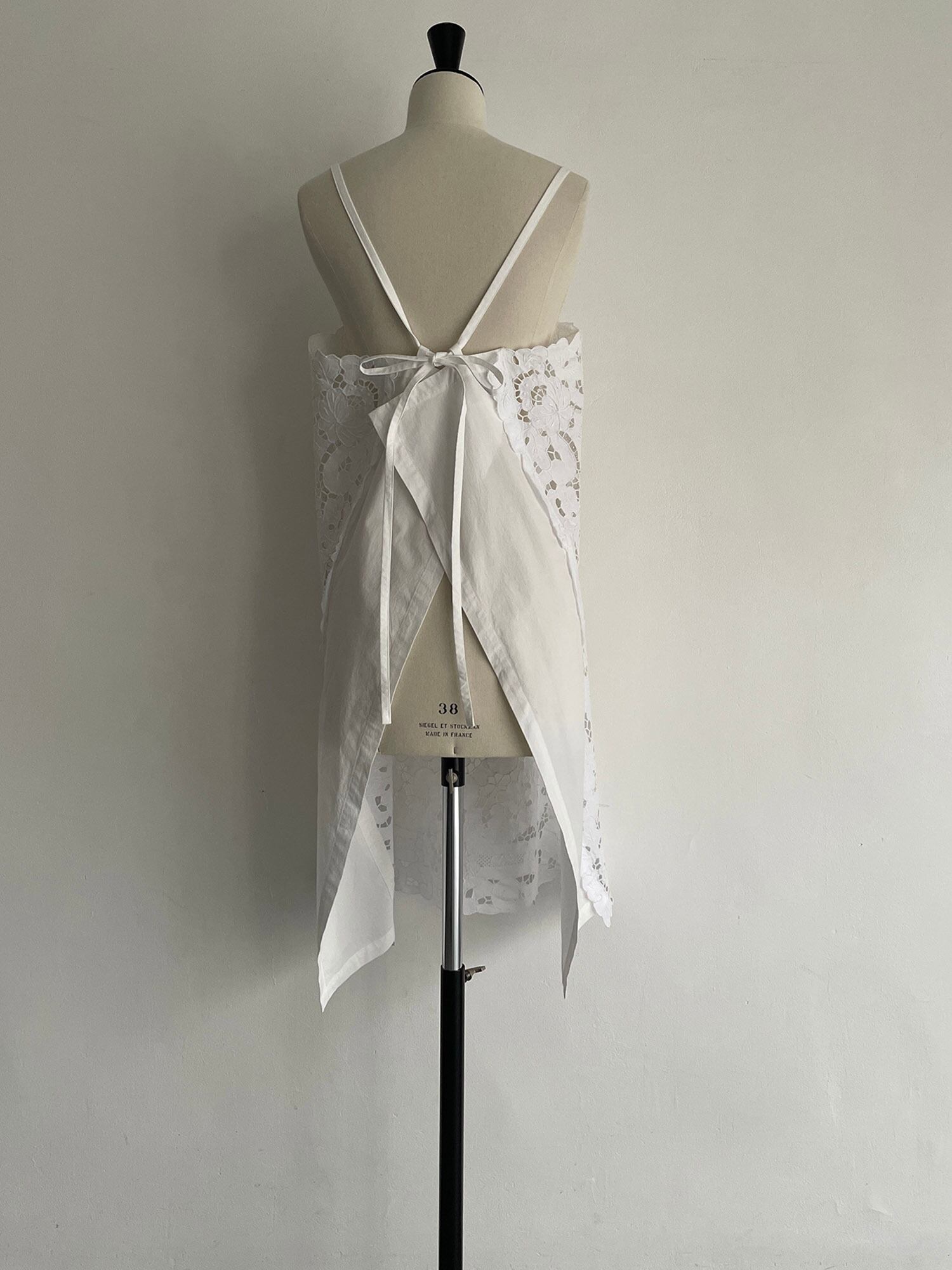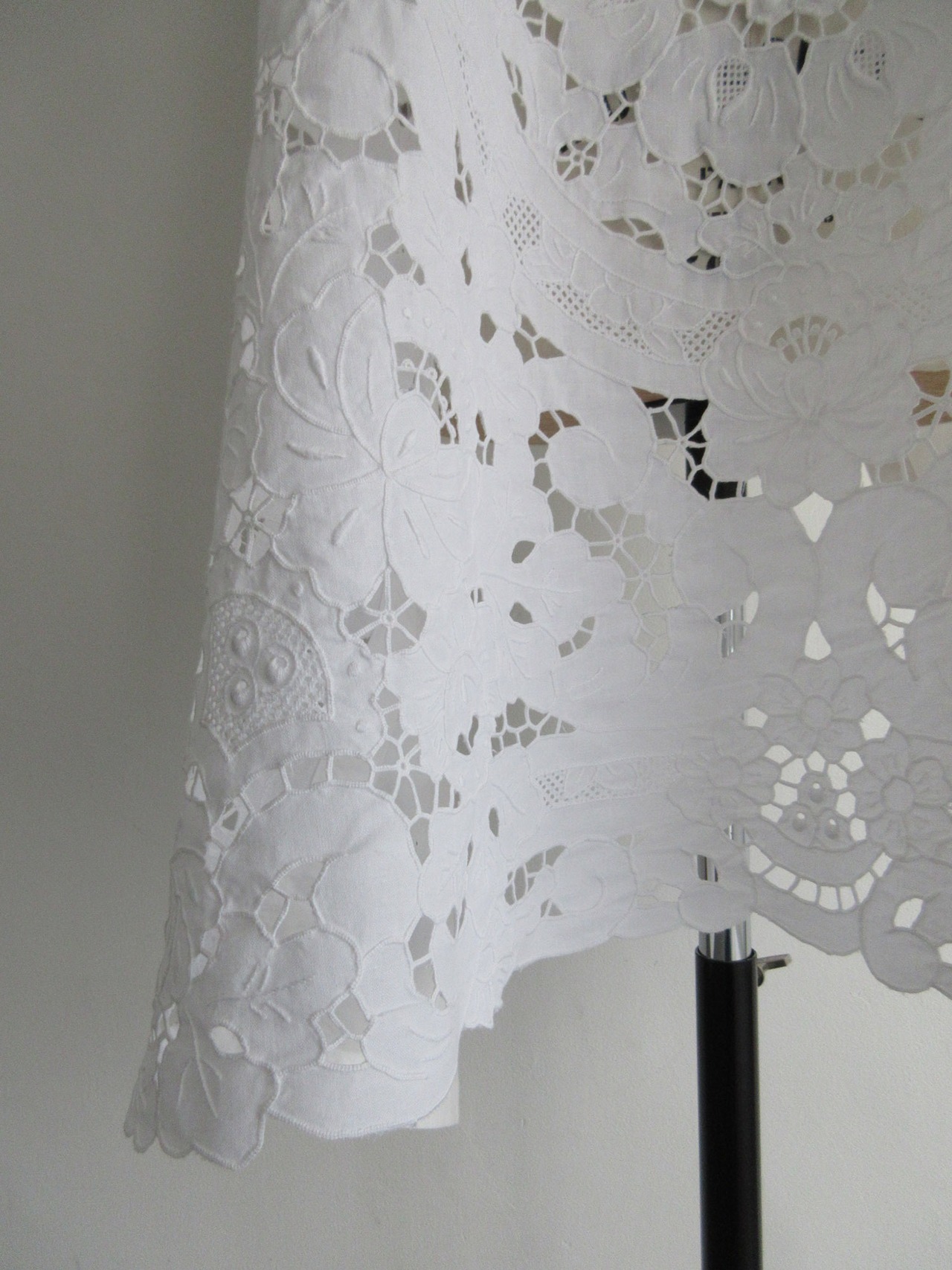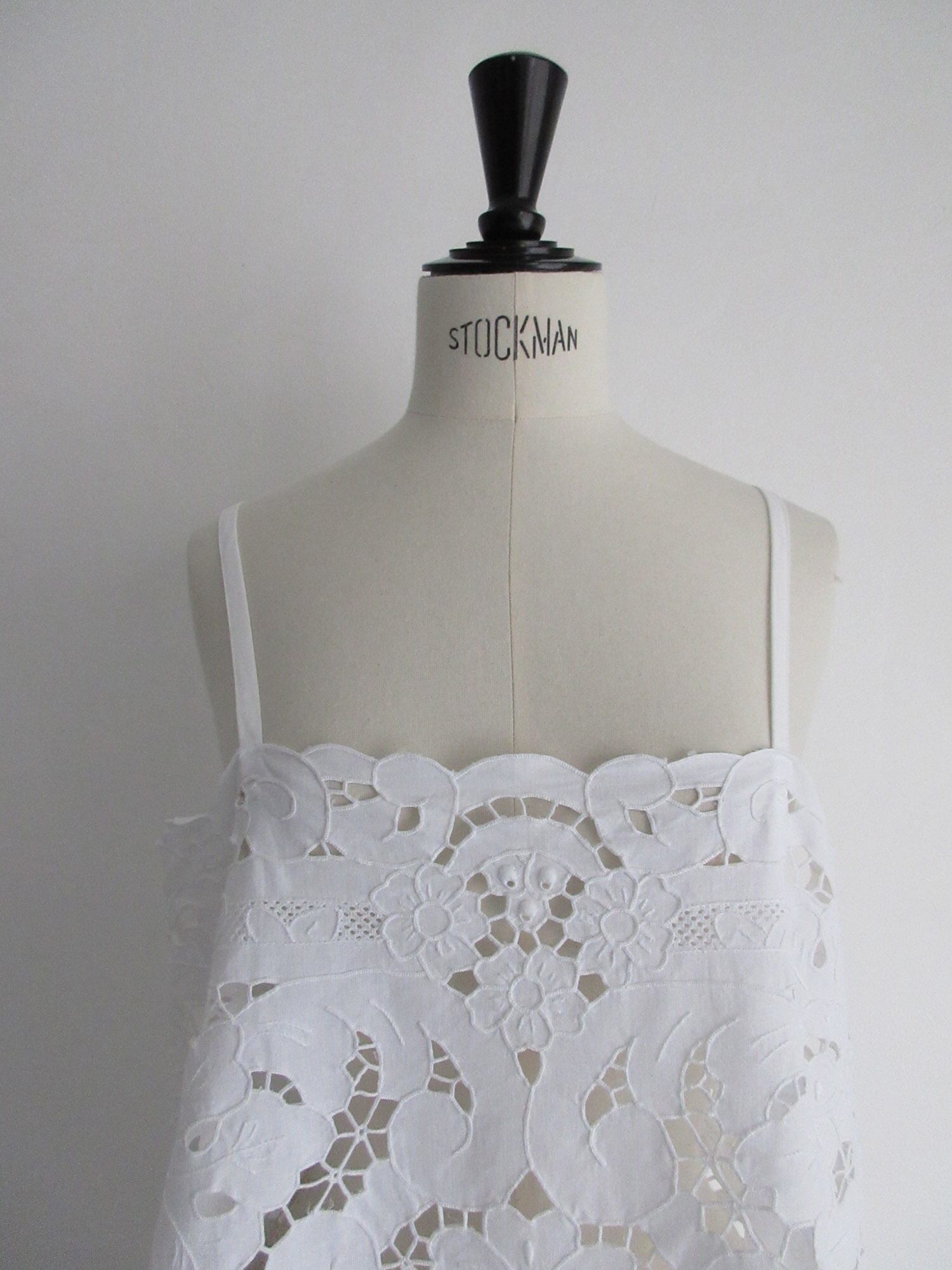 中国汕頭でヨーロッパ向けに作られていた、デットストックのカットワーク刺繍のテーブルクロスをリメイクしたエプロンドレスです。