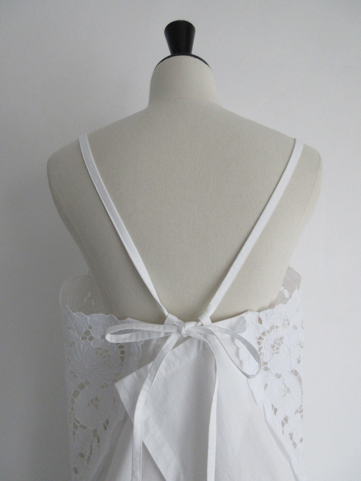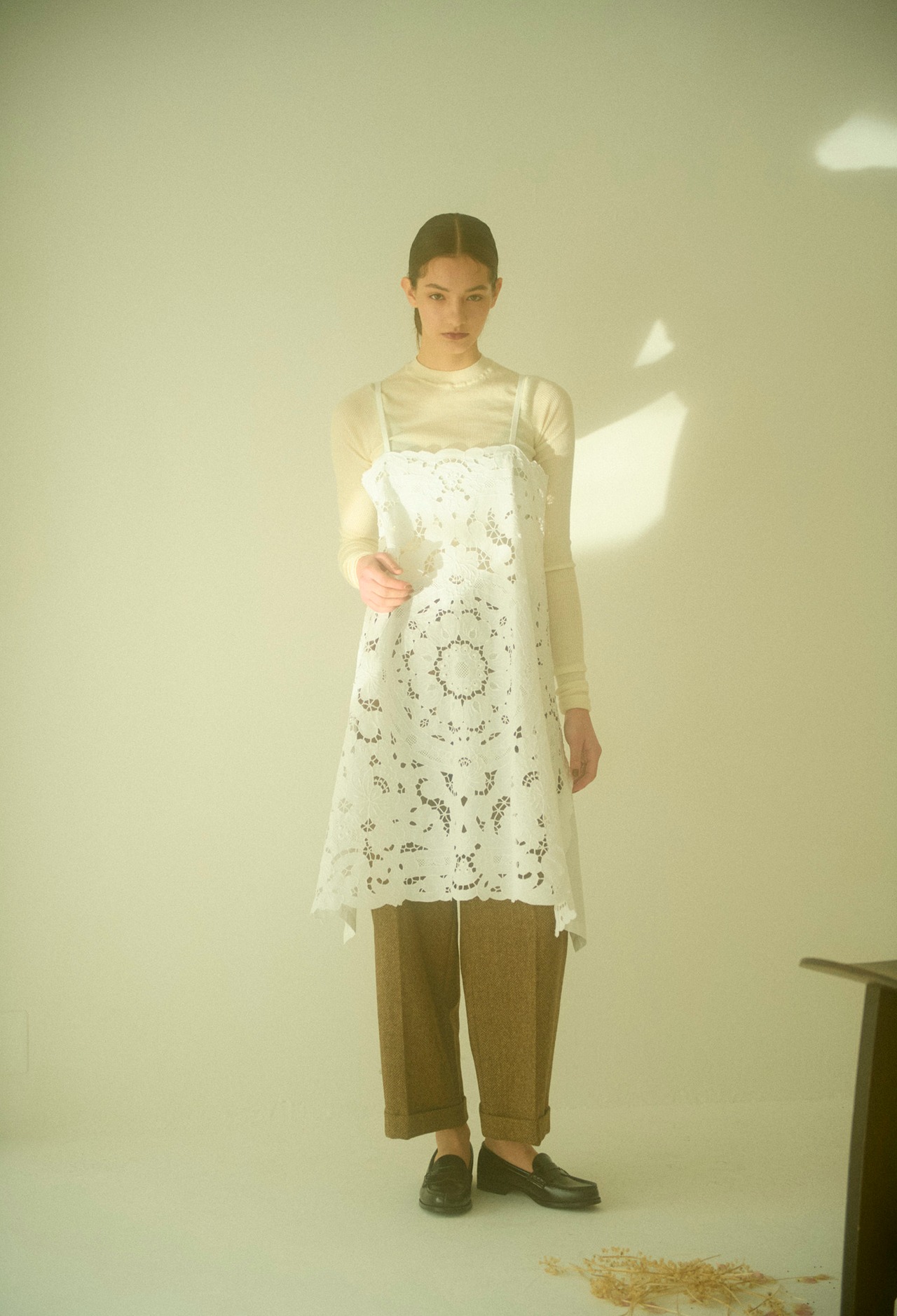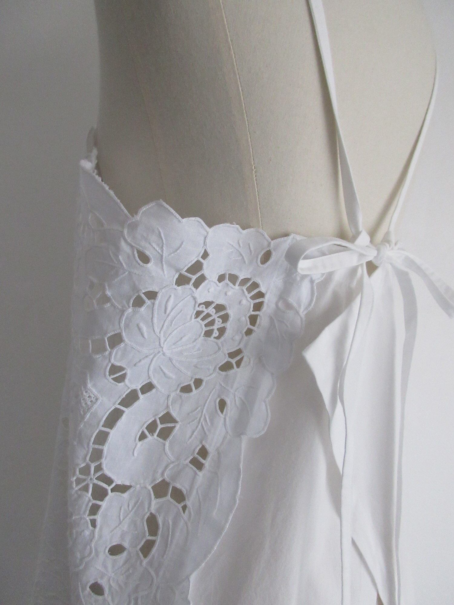 中国汕頭でヨーロッパ向けに作られていた、デットストックのカットワーク刺繍のテーブルクロスをリメイクしたエプロンドレスです。