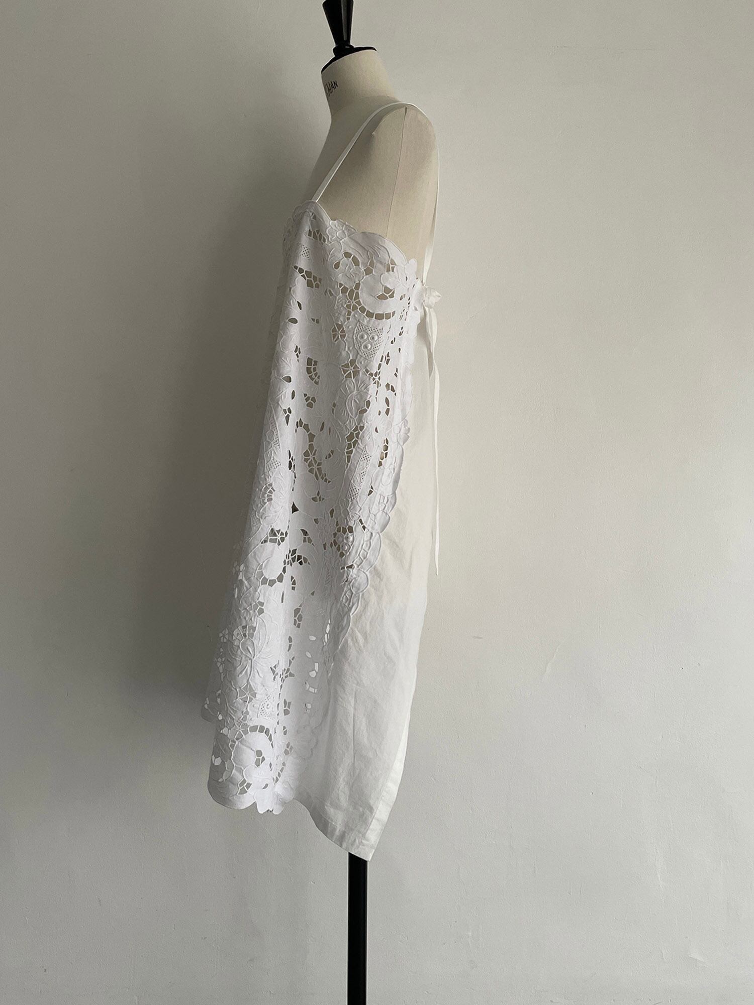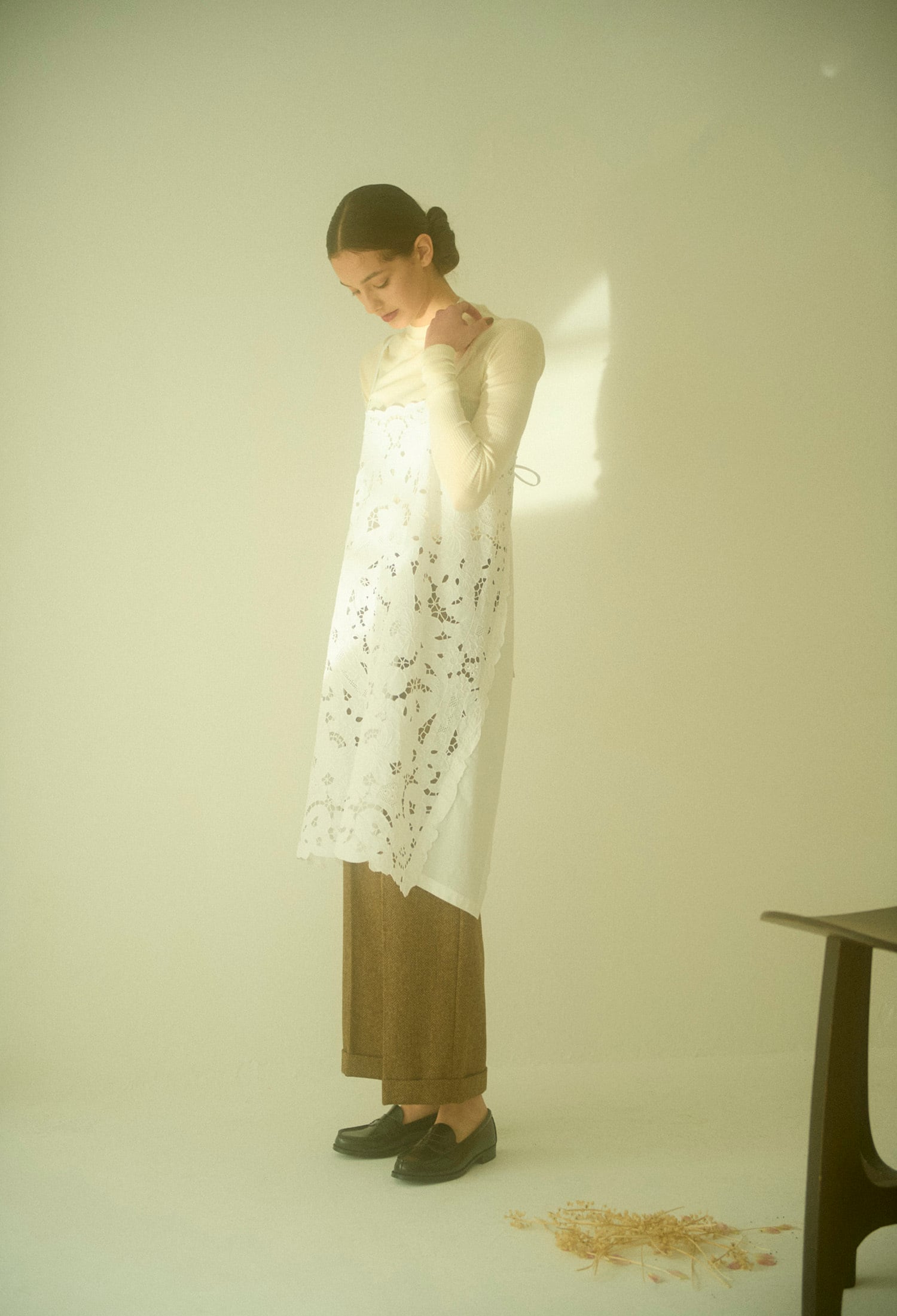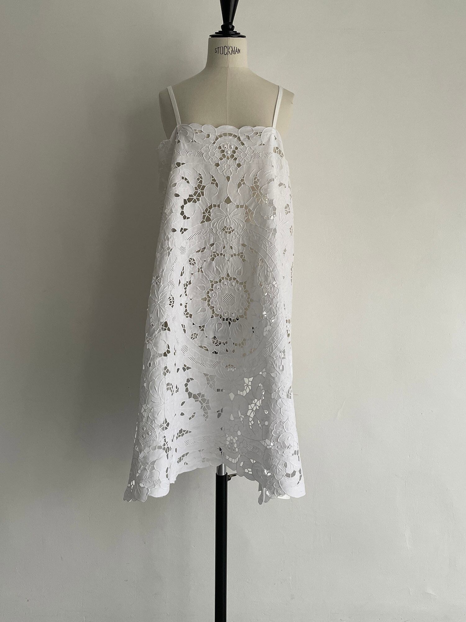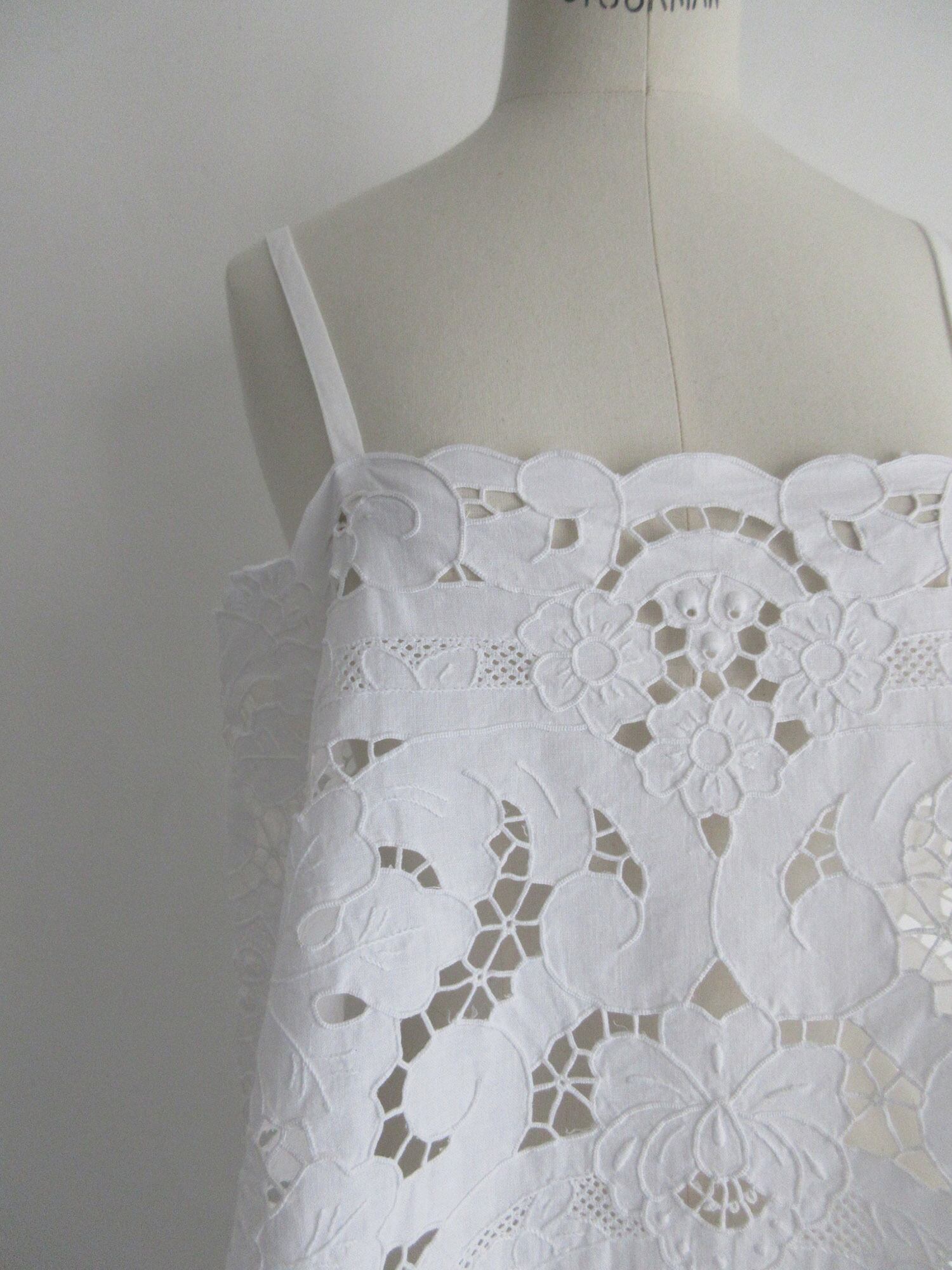 中国汕頭でヨーロッパ向けに作られていた、デットストックのカットワーク刺繍のテーブルクロスをリメイクしたエプロンドレスです。