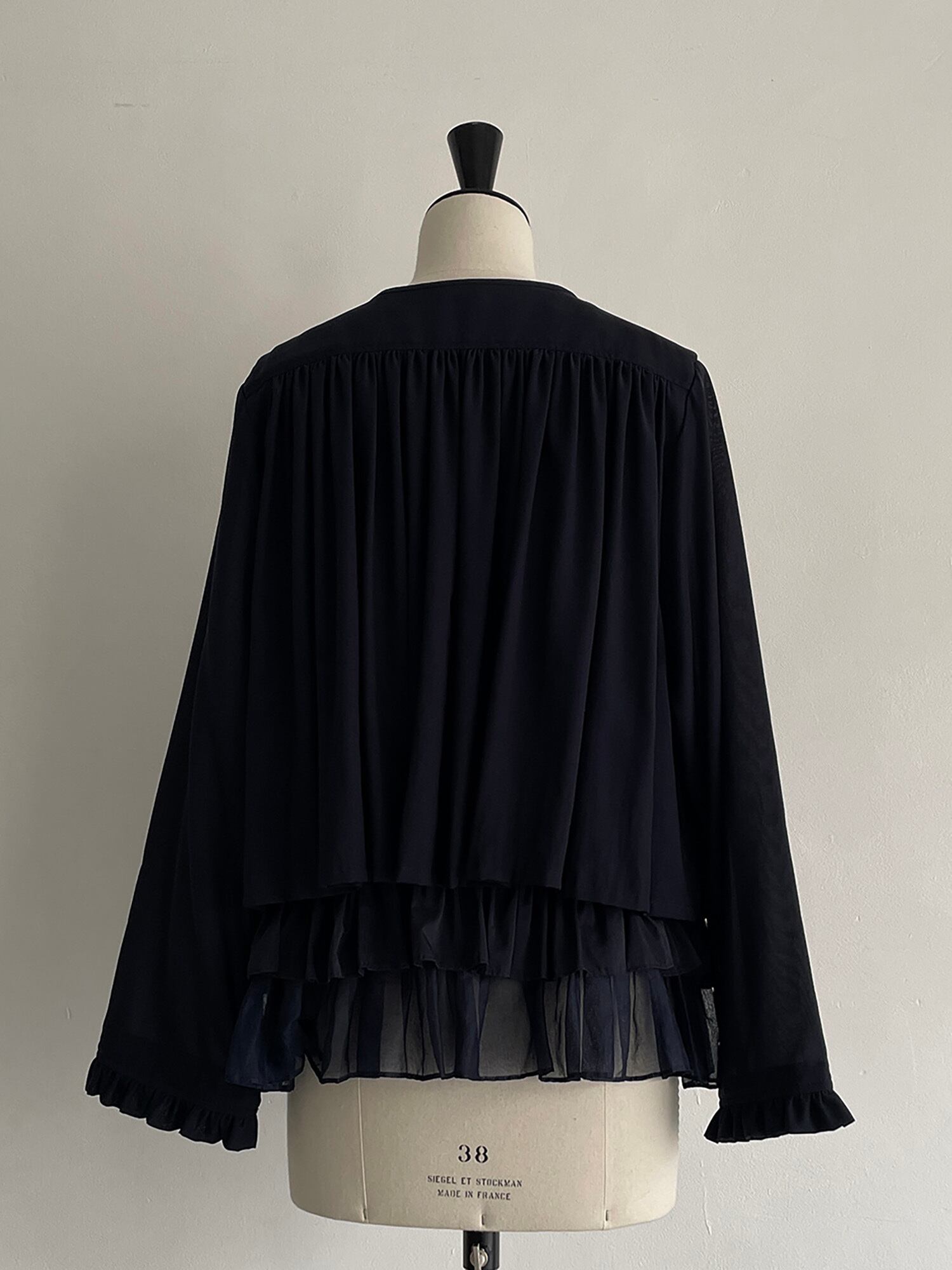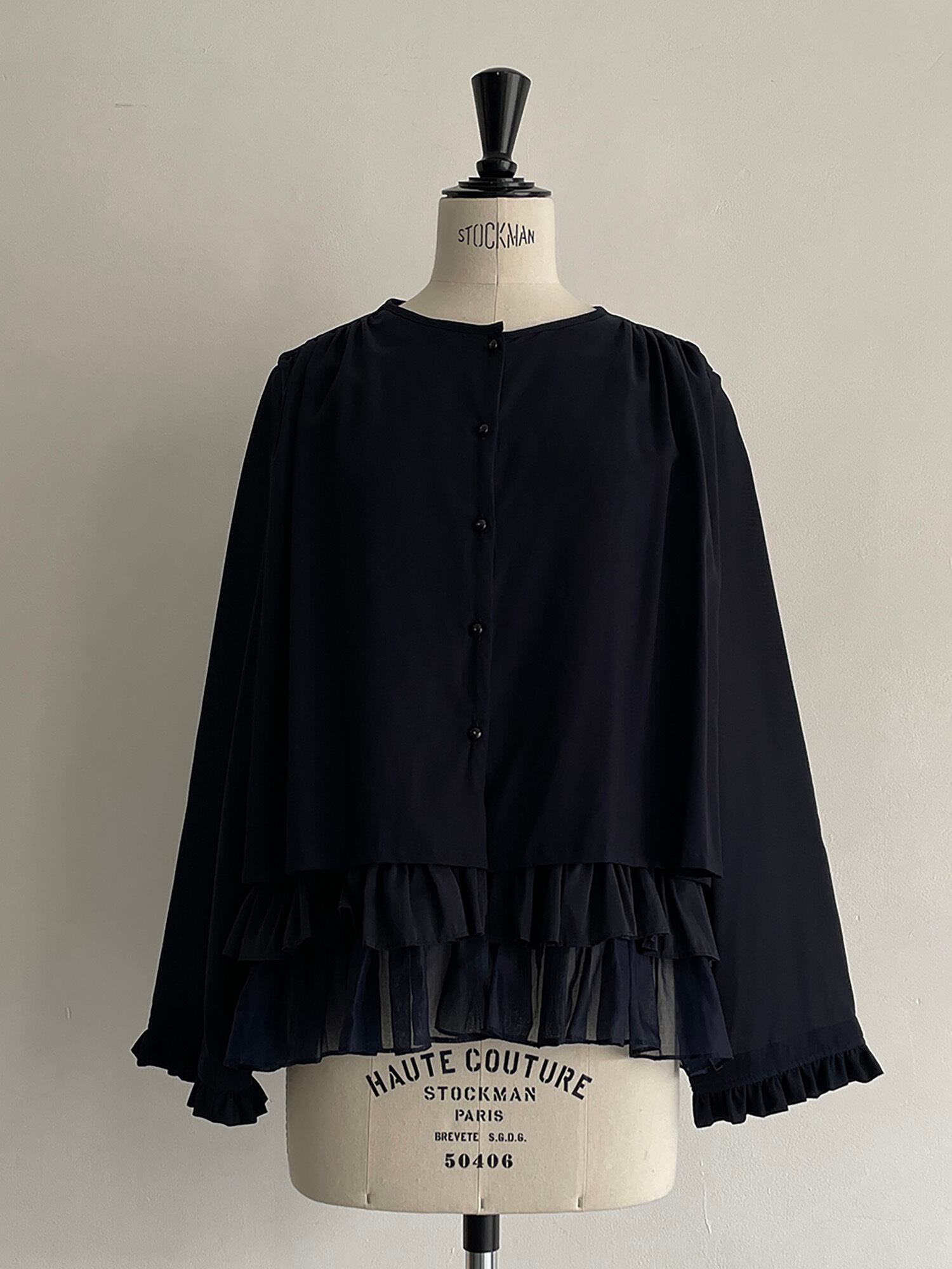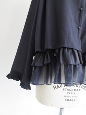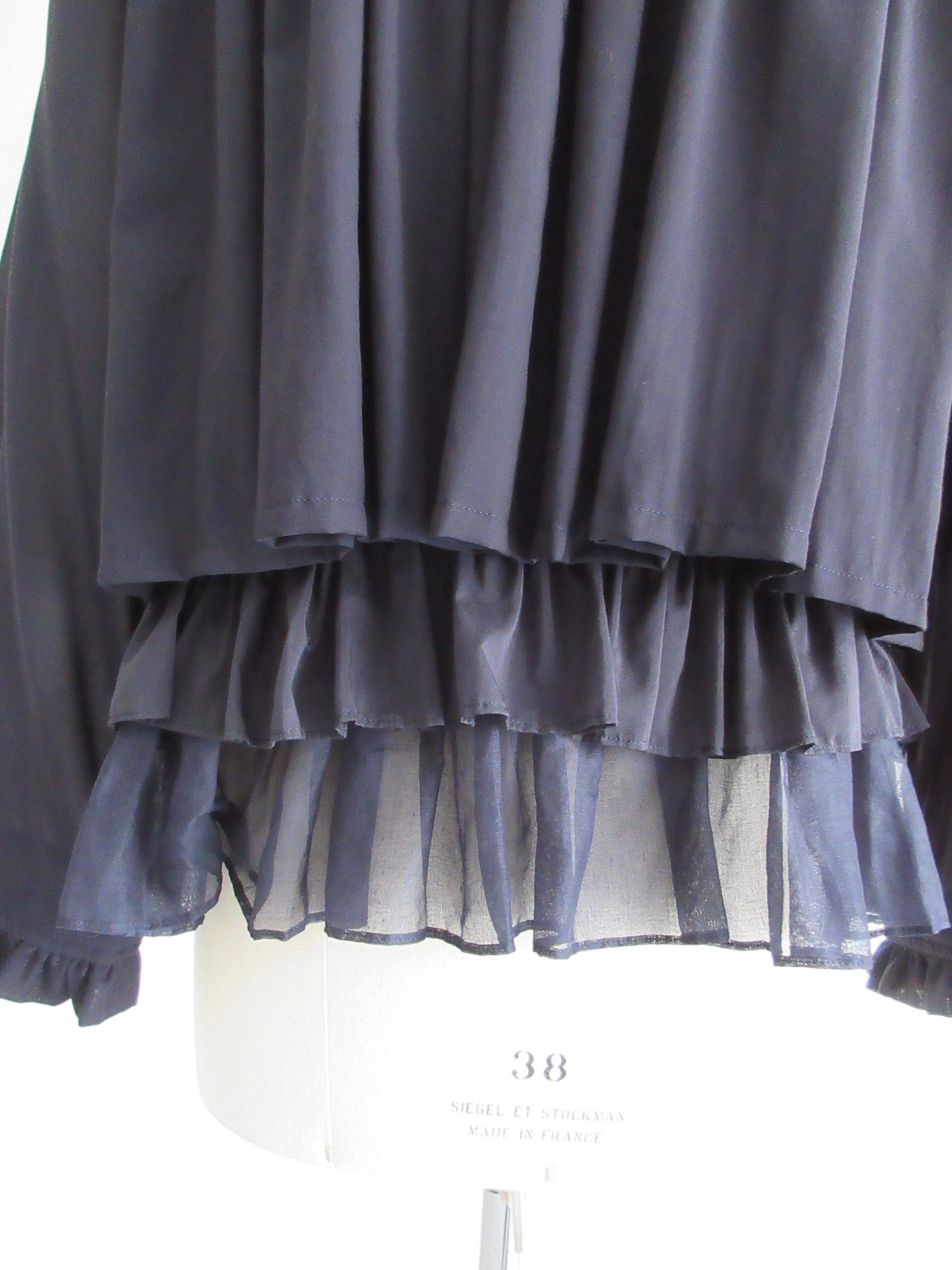 キュプラコットンの生地をベースに、2種類の生地のフリルを裾にあしらった、ブラウスです。